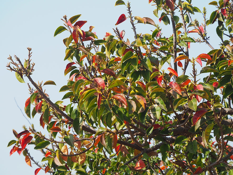 ใบ เป็นใบเดี่ยว เรียงเวียนสลับ รูปรีหรือ รูปไข่แกมรี ถึงรูปไข่กลั บ ขนาด 2 - 5 x 4 - 9 เซนติเมตร ปลายใบกลม ถึงเว้าตื้น ๆ หรือเรียวแหลมมน ฐานใบมน ขอบใบหยักเป็นคลื่นเล็กน้อย ใบเกลี้ยงทั้งสองด้าน แผ่นใบนิ่มคล้ายหนัง มีสีเขียวเป็นมัน และจะเปลี่ยนเป็นสีแดงอิฐ เมื่อใบใกล้ร่วง ก้านใบเรียว ยาว 1 - 2.5 เซนติเมตร